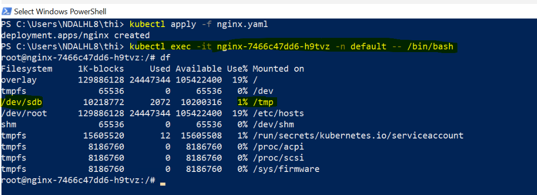 To connect to the running Azure container instance, use the following command and run the df command to view the volumes: