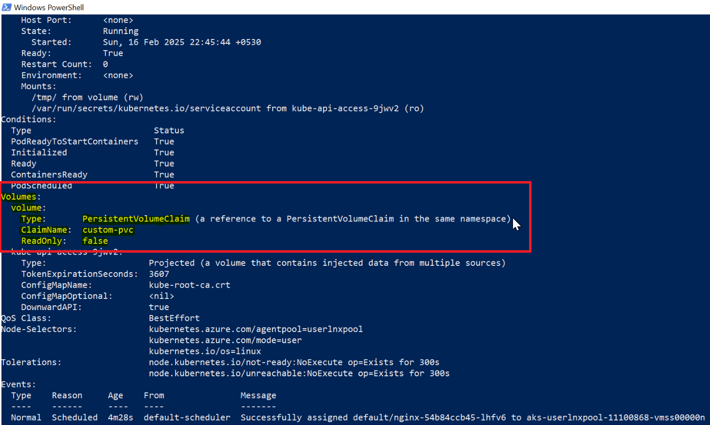 You can see that the volume is listed and and uses the claim name “custom-pv.”